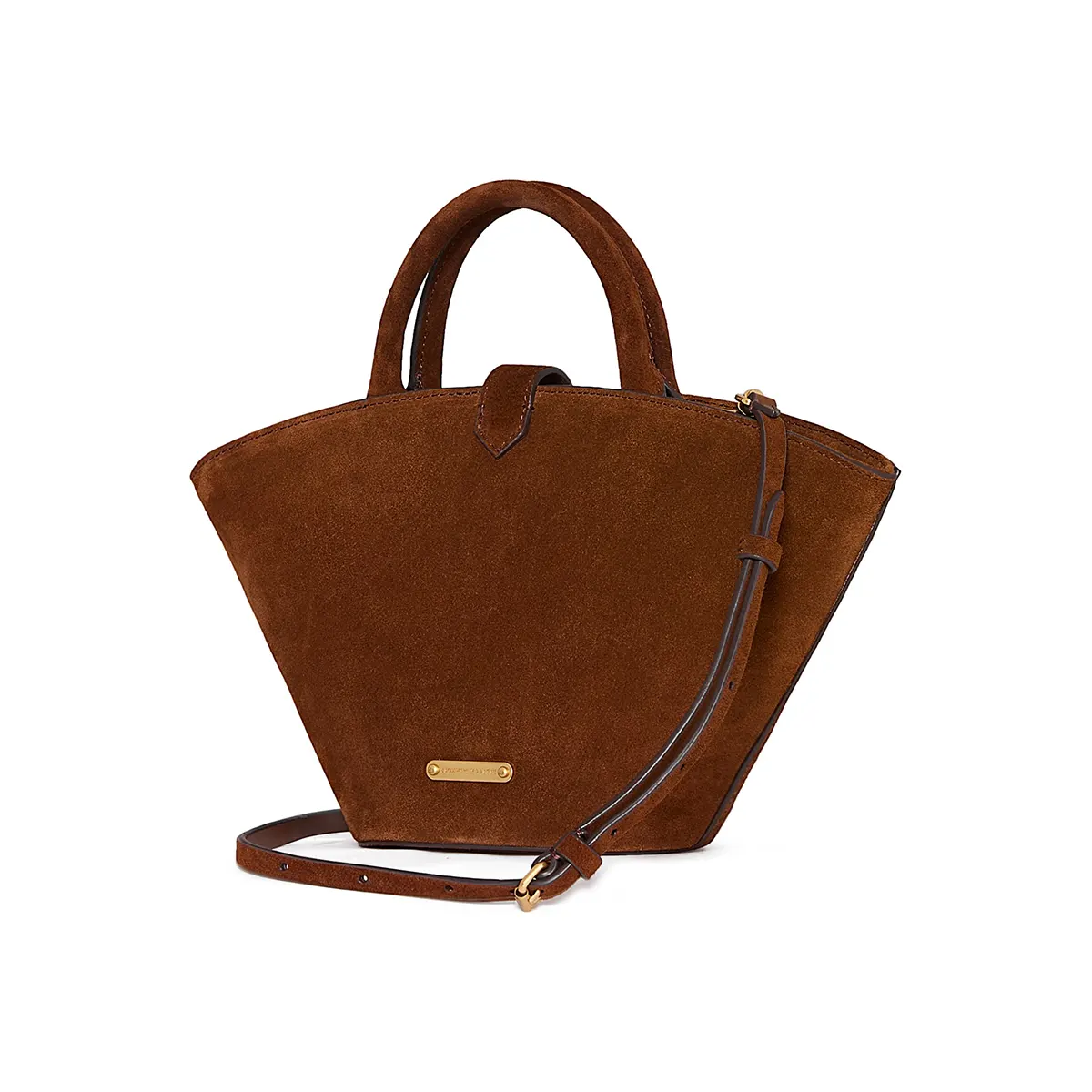The Mini Megan Suede Fan Tote by Rebecca Minkoff is a chic mini leather tote bag that combines suede with sophisticated detailing to create a stylish yet functional accessory. Crafted from supple suede, this structured tote features expanded side panels that offer a surprisingly roomy interior, perfect for carrying all your essentials in a compact, elegant design.