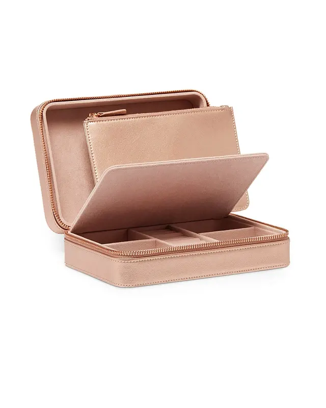 This medium-sized travel jewelry case offers a blend of style and functionality, perfect for organizing your accessories on the go. Its structured design ensures durability, while the cushioned interior provides protection for your jewelry. The case includes multiple compartments for rings, earrings, and bracelets, along with a removable pouch for added convenience.