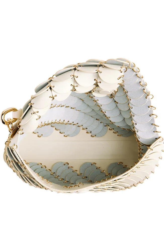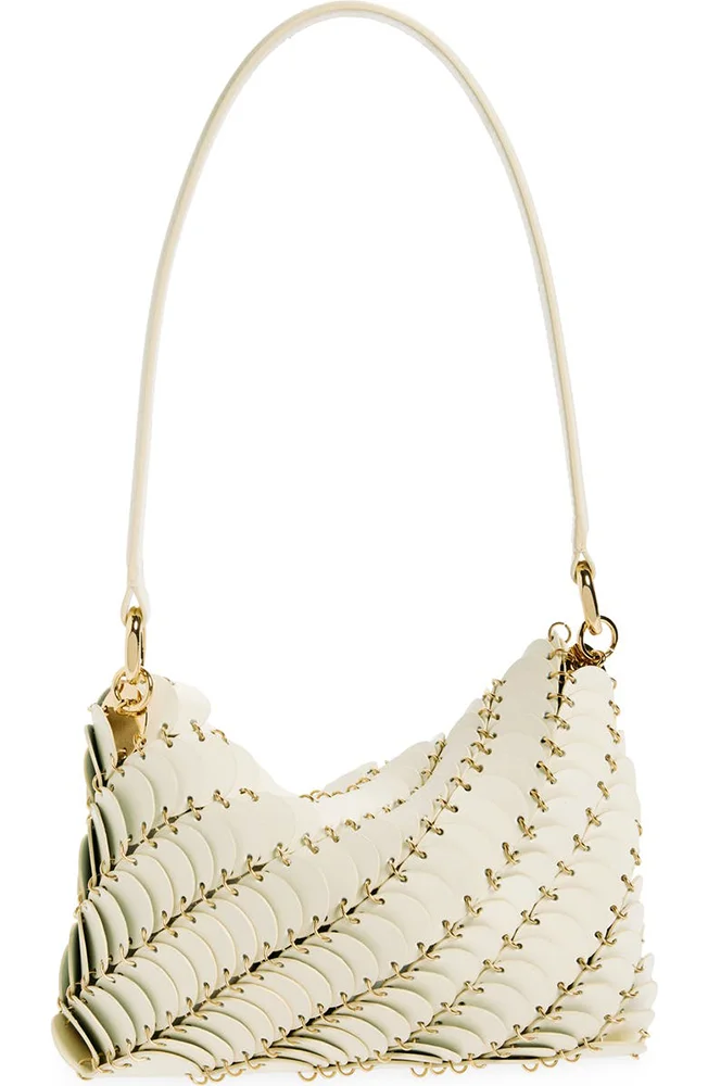 - Crafted from leather with Rabanne’s signature ring-pierced disc design