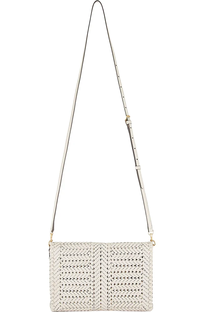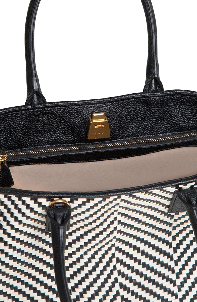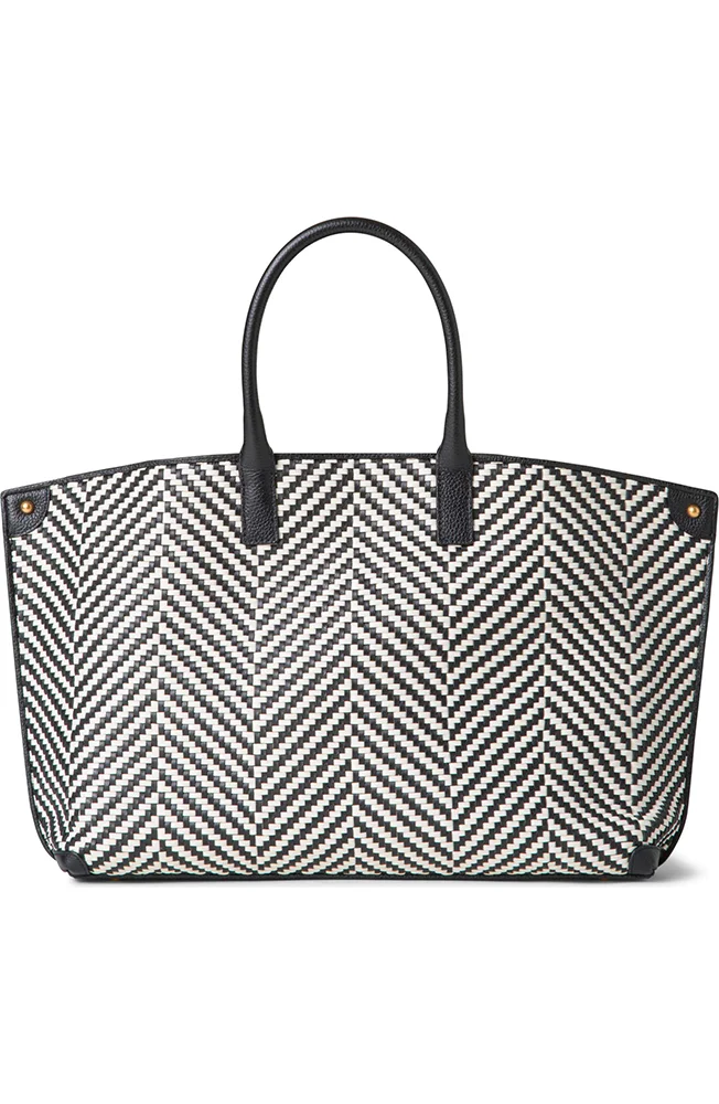 - Crafted from woven calfskin leather with a striking herringbone motif